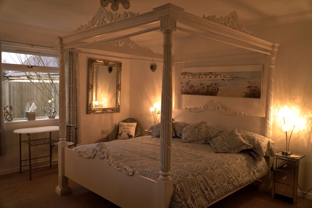 As you step inside, The Hot Tub Hideaway welcomes you with its own private entrance, leading to an inviting entrance hall adorned with a breakfast bar and a fully-equipped kitchen. Discover two generously-sized bedrooms, each boasting its own ensuite bathroom. Choose between the enchanting super king four-poster bed or the opulent king-sized rococo bed for your peaceful night’s rest.