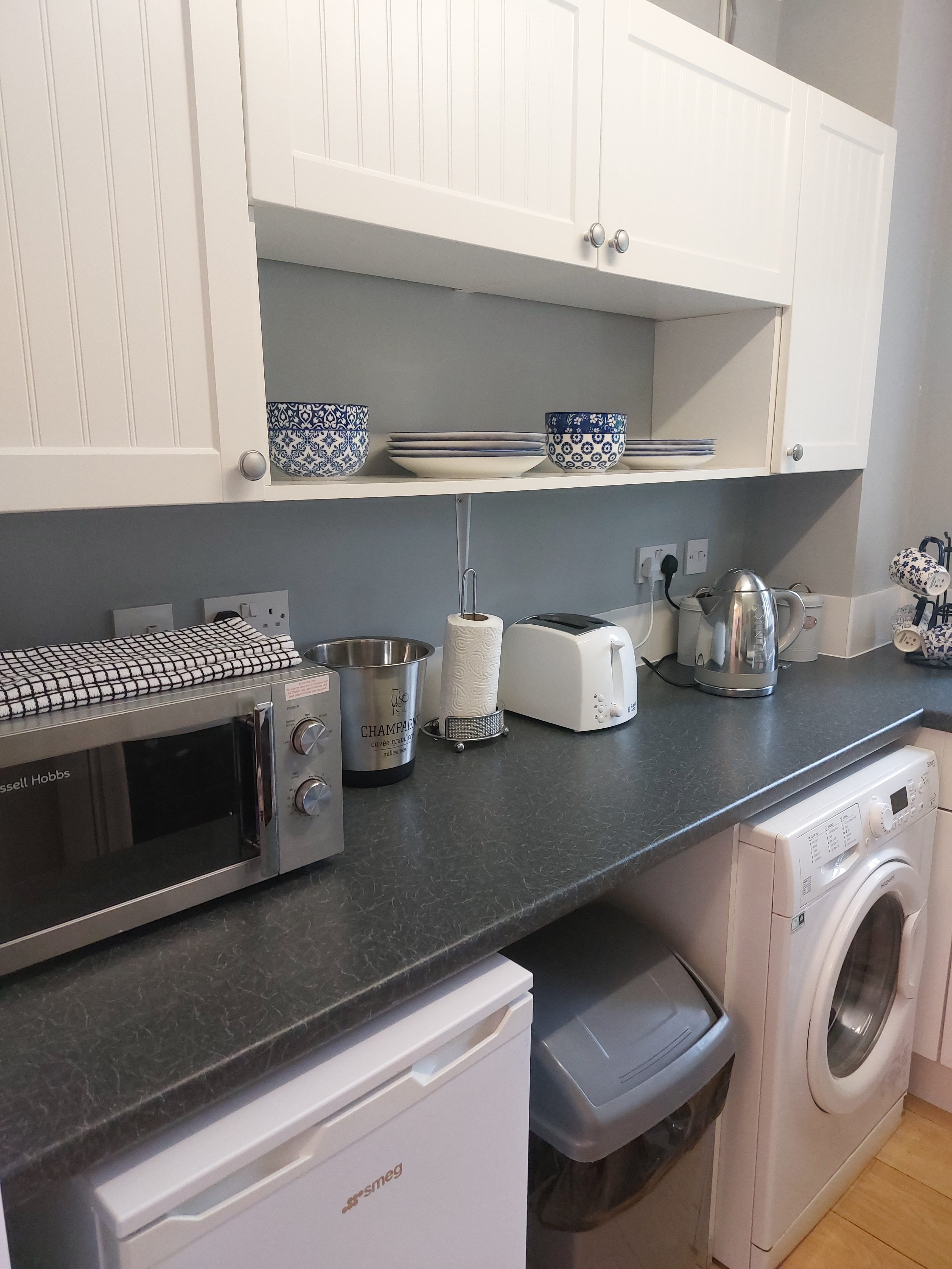 The bedroom has a luxurious super king sized four poster bed and en-suite bathroom. Fully fitted kitchen – everything needed for a self catering holiday.